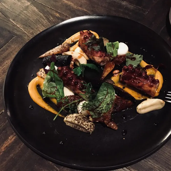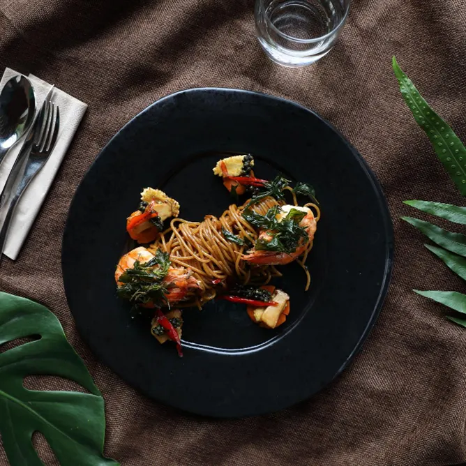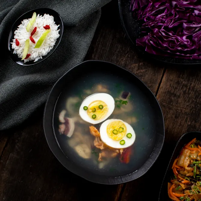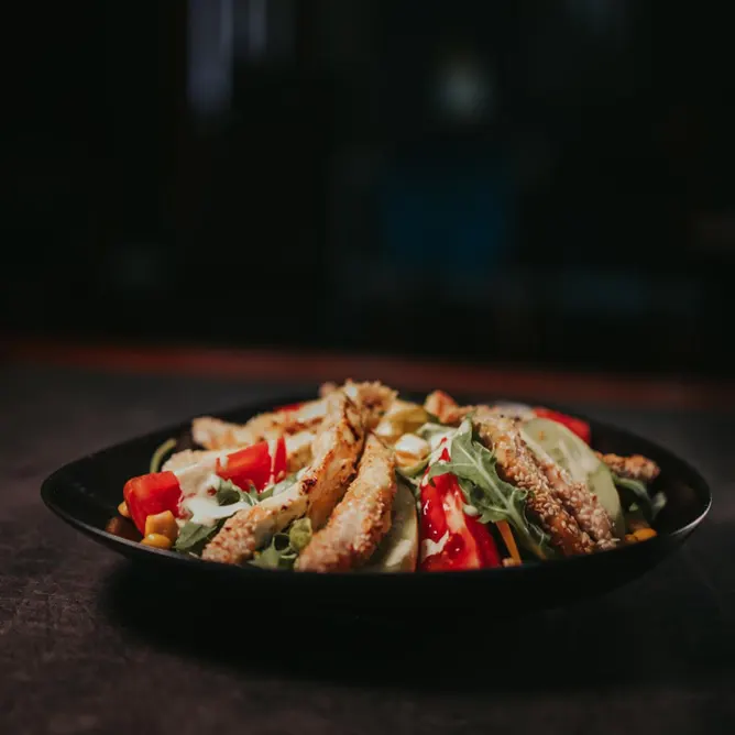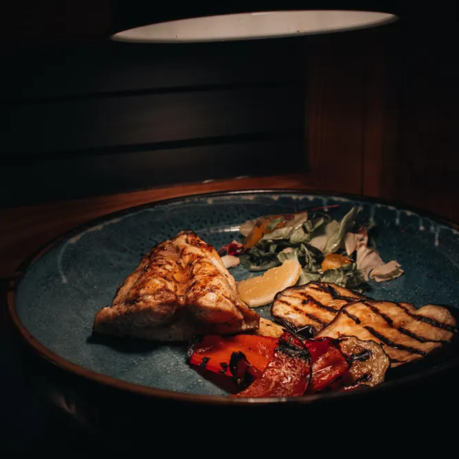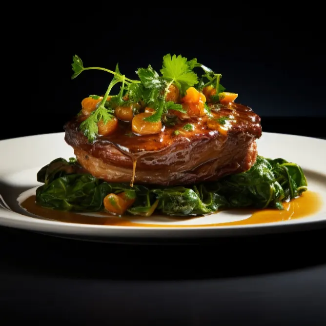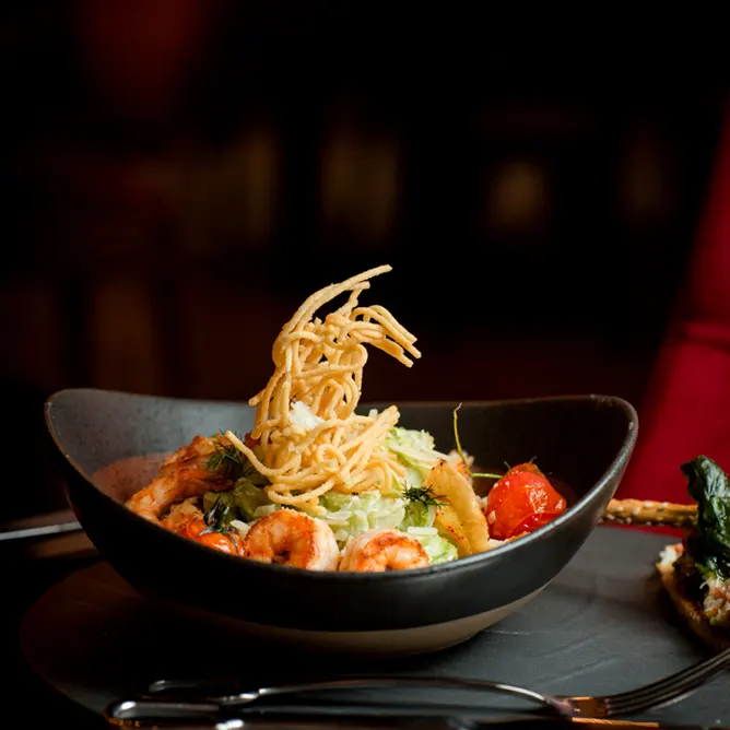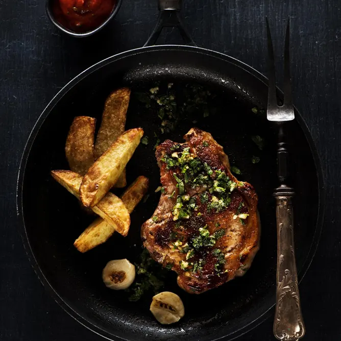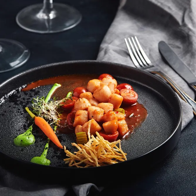 Gallery Pork chop with wedges Stew bowls with garnish Soup with eggs and rice Crispy chicken salad Pasta with grilled chicken Glazed meat on spinach Grilled octopus with sauces Grilled fish and veggies Shrimp salad with noodles Noodles with shrimp Seared meat in foam Scallops with tomato sauce